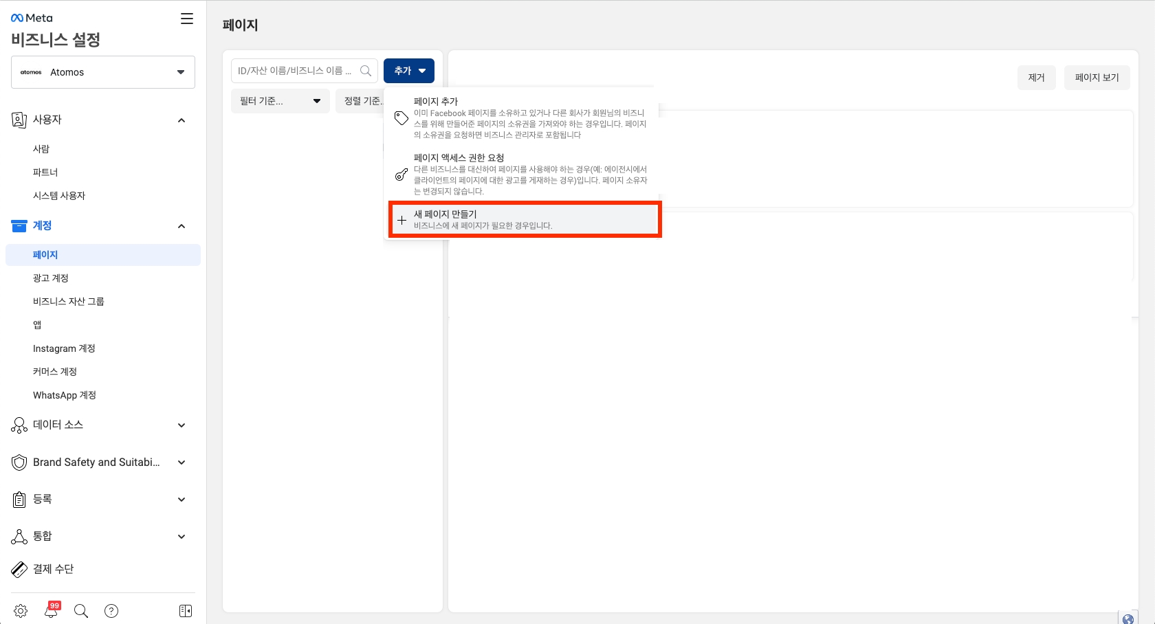 Step 3. 좌측 메뉴 계정 > 페이지> 추가 > 새 페이지 만들기를 진행해주세요.