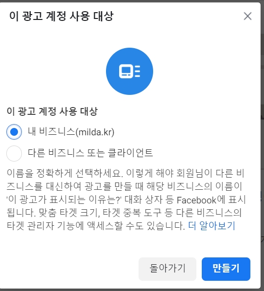 페이스북 비즈니스 계정 생성 먼저 진행해주세요.