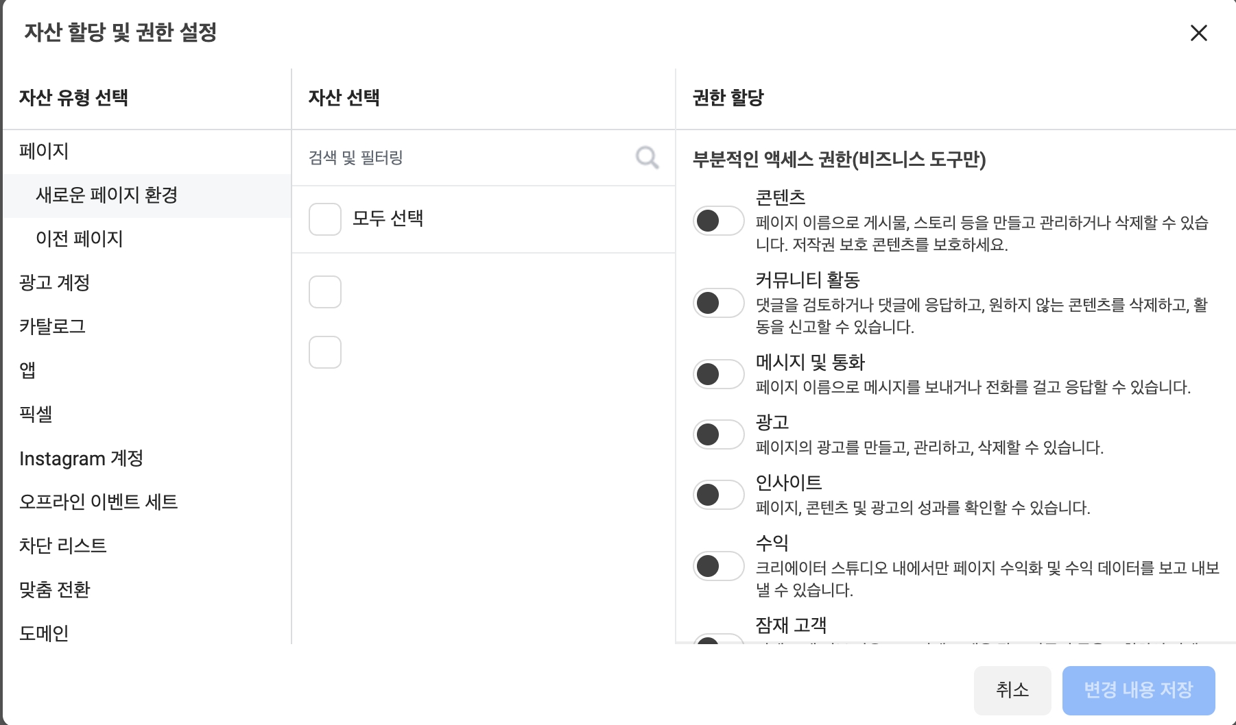 Step 4. 자산 유형 선택 > 자산 선택 > 권한을 할당할 항목에 ON > [변경 내용 저장]을 클릭해주세요.