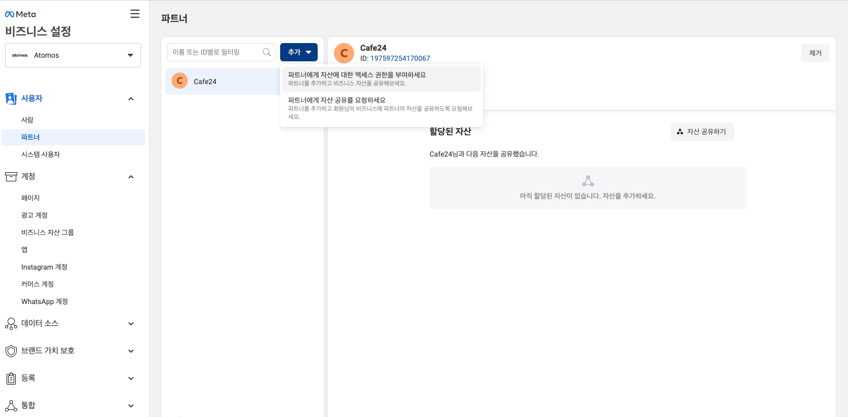 Step 3. 좌측 메뉴 사용자 > 파트너 > [추가] 버튼 클릭 > 파트너에게 자산에 대한 엑세스 권한을 부여하세요.